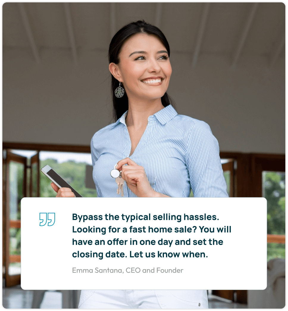 Bypass the typical selling hassles. Looking for a fast home sale? You will have an offer in one day and set the closing date. Let us know when.